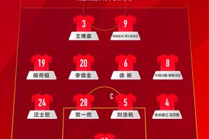 U22國足首發(fā):12-霍深坪、19-胡荷韜、4-吾米提江、5-劉浩帆、24-汪士欽、28-賀一然、3-王博豪、6-徐彬、20-李鎮(zhèn)全、8-木塔力甫、9-拜合拉木