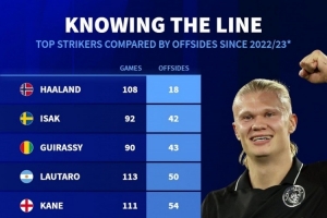 哈蘭德——108場越位18次