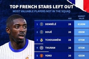 體育資訊11月14日訊 德國(guó)轉(zhuǎn)會(huì)市場(chǎng)統(tǒng)計(jì)了無(wú)緣本期法國(guó)隊(duì)名單球員的身價(jià),并列出榜單,登貝萊1億歐居首。