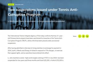 21歲的網(wǎng)球選手李文夫與張瑾在2024年的調(diào)查中坦言,此前為獲取報酬參與了比賽操縱。因為二人未對ITIA指控作出回應,也未行使上訴權(quán)利,相關(guān)制裁已正式生效。