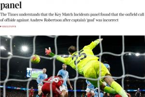 體育資訊11月14日訊 英媒《泰晤士報》報道,英超專家組已經(jīng)裁定,上輪英超范戴克對曼城的進球應(yīng)被判有效。