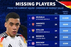 體育資訊11月15日訊 德轉(zhuǎn)列德國落選本次國家隊名單的球員身價排行,穆西亞拉1.4億歐居首,哈弗茨6000萬歐第二,斯蒂勒4500萬歐第三。