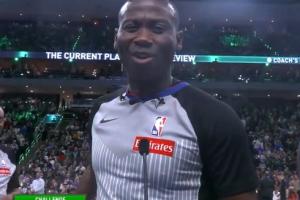 “我們都沒看到是誰出界,判罰結(jié)果是隨便來兩個人(any two)中圈跳球。雄鹿對這球提出了挑戰(zhàn)?!?/p>