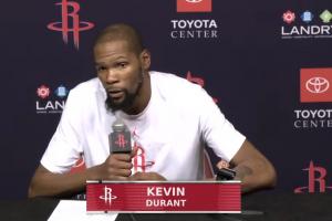 賽后,杜蘭特參加新聞發(fā)布會(huì),接受了記者的采訪。