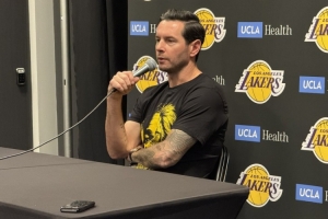 賽前湖人主帥雷迪克穿了一件定制的艾頓球衣出席了新聞發(fā)布會,這件球衣正面是艾頓的臉和獅子的圖案拼接而成。