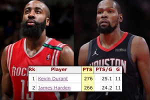 在代表火箭出戰(zhàn)的前11場比賽中,杜蘭特合計(jì)得到276分,超越哈登(266),隊(duì)史最多。