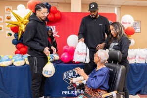 德安德烈·喬丹和米卡·皮維代表球隊(duì)向新奧爾良社區(qū)的居民發(fā)放火雞和感恩節(jié)食材,提前預(yù)祝球迷節(jié)日快樂(lè)。