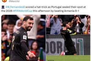 曼聯(lián)官推也曬出B費慶祝進球照片,配文寫道:“在葡萄牙9-1擊敗亞美尼亞的比賽中B費上演帽子戲法,葡萄牙也鎖定世界杯參賽名額?!?/p>