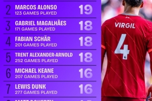 1、范戴克:257場21球