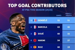 巴黎本賽季球員直接參與進(jìn)球榜:(進(jìn)球+助攻)