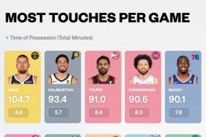其中約基奇以場均104.7次觸球排名聯(lián)盟第一,持球時間為4.6分鐘;哈利伯頓場均觸球93.4次,持球5.7分鐘排名第二;特雷-楊91次觸球(持球8.4分鐘)排名第三。數(shù)據(jù)顯示,杰倫-約翰遜是榜單中單次觸球所需時間最少的球員,約老師則是第二。