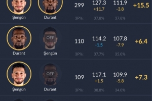 杜蘭特和申京同場(chǎng)時(shí),火箭進(jìn)攻效率127.3,防守效率111.9,凈效率+15.5;