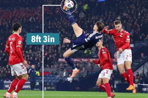 據(jù)太陽報統(tǒng)計,麥克托米奈倒鉤時腳部高度達(dá)到了8英尺3英寸(約2.53米),比C羅在皇馬時對陣尤文的倒鉤高度(7英尺7英寸,約2.38米)還要高。
