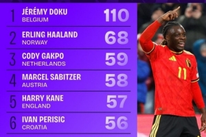 本屆世歐預(yù)在對方禁區(qū)內(nèi)觸球榜: