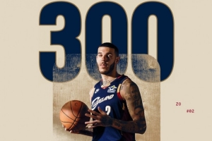比賽首節(jié),騎士球員朗佐·鮑爾替補出戰(zhàn)。球隊官方也曬出海報,祝賀鮑爾達成生涯300場里程碑。