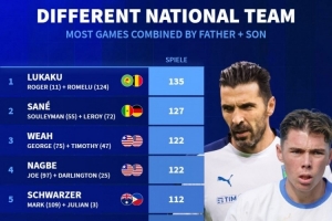 足壇父子代表不同國(guó)家隊(duì)合計(jì)出場(chǎng)次數(shù)(排在前面為父親):