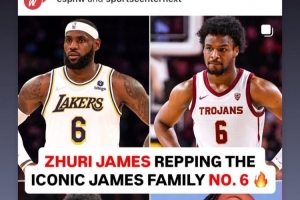 詹姆斯轉(zhuǎn)發(fā)了媒體曬出的他和三個子女都身穿6號球衣的照片。詹姆斯的兩個兒子布朗尼和布萊斯在大學(xué)打籃球時都身穿6號球衣,女兒Zhuri在學(xué)校打排球時身穿6號球衣。詹姆斯本人在熱火和湖人也有6個賽季身穿6號球衣。