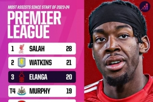 據(jù)Opta數(shù)據(jù)統(tǒng)計(jì),自2023-24賽季以來(lái),英超的助攻榜單中,薩拉赫以28次獨(dú)占鰲頭,維拉前鋒沃特金斯21次排名第二,伊蘭加20次排名第三。