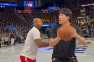 賽前,楊瀚森在助教陪同下進行熱身,對抗后連續(xù)勾手命中,同時送出單臂暴扣,三分7中7。
