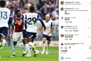 熱刺前鋒理查利森更新社媒動態(tài),曬出庫杜斯與熱刺球員在球場上發(fā)生沖突的照片,配文:“歡迎加入熱刺大家庭,庫杜斯??”