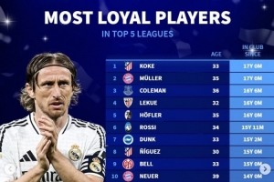 18.莫德里奇(皇家馬德里),39歲,12年10個(gè)月