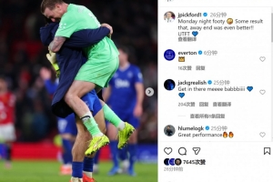 皮克福德社媒曬出慶祝的照片,配文:“周一足球之夜,這樣的結(jié)果太棒了,客場看臺的氛圍更是無敵,加油埃弗頓!”