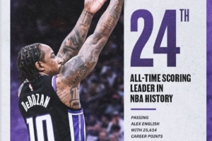 此役過后,德羅贊生涯總得分來到了25629分,超越了英格利什,來到NBA歷史第24位,將追趕卡特(25728)。