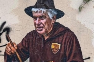 意甲積分榜領(lǐng)跑,羅馬主帥加斯佩里尼在壁畫中被畫成巫師