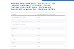 在游泳選手人數(shù)最多的10支隊伍中,中國隊人均接受檢查8.8次,其中男子短距離自由泳選手王浩宇13次,覃海洋和楊佩琪各12次,柳雅欣、彭旭瑋和孫佳俊各11次。接受檢查次數(shù)第二多的是中立運(yùn)動員(俄羅斯),人均8.2次。美國隊和澳大利亞隊分別是4.13次和4次。此后的排位依次是法國、意大利、匈牙利、日本、加拿大和英國隊。