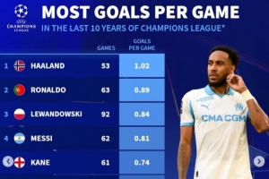 德轉(zhuǎn)列近10年歐冠場(chǎng)均進(jìn)球榜:至少出場(chǎng)25次