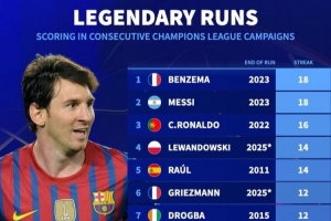 體育資訊11月27日訊 《轉會市場》統(tǒng)計了歐冠歷史賽季連續(xù)進球情況,梅西和本澤馬并列居首。