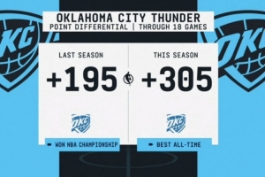 本賽季前18場(chǎng)比賽雷霆總凈勝分為+305,為NBA歷史最佳;上賽季同期雷霆該數(shù)據(jù)為+195。