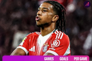 1、拜仁 19場65球,場均3.42球