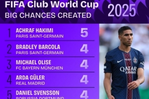 體育資訊7月11日訊 本屆世俱杯僅剩巴黎vs切爾西的決賽,數(shù)據(jù)機(jī)構(gòu)squakwa也統(tǒng)計(jì)了本屆賽事創(chuàng)造重大機(jī)會(huì)情況,邊后衛(wèi)阿什拉夫居首。