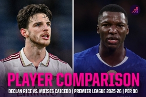 賴斯、凱塞多本賽季英超每90分鐘數據: