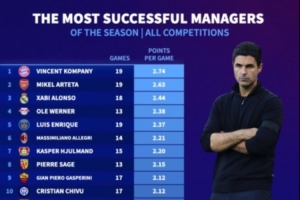 體育資訊11月28日訊 本賽季五大聯(lián)賽中,拜仁和阿森納均有著極為出色的表現(xiàn)。德國轉會市場盤點了五大聯(lián)賽主帥場均拿分情況,孔帕尼、阿爾特塔和阿隆索位居前三。值得一提的是,這三名主帥都是名副其實的少壯派。