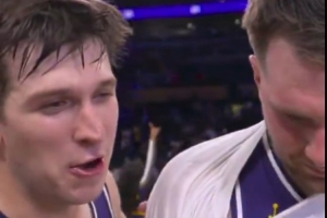 賽后東契奇接受采訪(fǎng)時(shí)里夫斯搶鏡:“我現(xiàn)在扣籃次數(shù)比他多?!?/p>