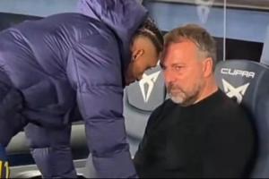 盡管主場(chǎng)取勝,但巴薩主帥弗里克對(duì)球隊(duì)本場(chǎng)比賽的表現(xiàn)似乎并不完全滿意。終場(chǎng)哨響后,DAZN的轉(zhuǎn)播鏡頭拍到弗里克一臉嚴(yán)肅地留坐在替補(bǔ)席上,與本場(chǎng)表現(xiàn)出色,被換下的拉菲尼亞交換著意見(jiàn)。交流過(guò)程中,弗里克神情嚴(yán)肅,幾次搖頭。