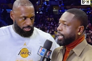 體育資訊12月2日訊 在上周六湖人對(duì)陣獨(dú)行俠的比賽中,韋德現(xiàn)身場(chǎng)邊采訪詹姆斯。