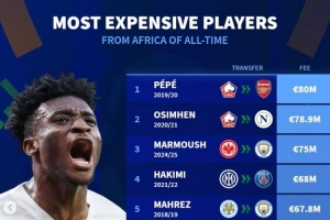 德轉列非洲球員歷史轉會費榜:歐元