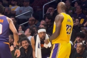 GIF-詹姆斯在場上和場邊的古德溫聊天