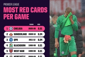 體育資訊12月2日訊 Opta統(tǒng)計了英超球隊各賽季的場均紅牌數(shù)量,并列出英超歷史單賽季場均紅牌數(shù)量排名,本賽季切爾西0.31張居首。