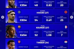 阿什拉夫(巴黎,27歲,摩洛哥):身價8000萬歐,54場,場均0.69丟球,直接參與25球