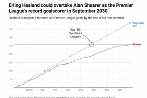如果哈蘭德能保持目前的良好狀態(tài),直到他九年半合同結束,他最終將達到389球——比希勒多129球。
