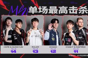 體育資訊7月12日訊?2025MSI敗決AL對(duì)陣T1賽前,官方發(fā)布了本屆MSI單場(chǎng)最高擊殺,Gumayusi、Hope 14次擊殺并列第一!