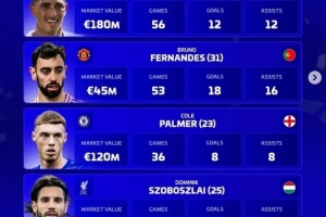 B費(fèi)(曼聯(lián),31歲,葡萄牙):身價(jià)4500萬歐,53場,18球,16助攻