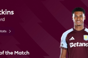 本場比賽沃特金斯梅開二度,成為球隊逆轉(zhuǎn)最大功臣,賽后他也當(dāng)選英超官方球迷票選全場最佳球員。