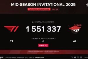 體育資訊7月12日訊 2025MSI敗者組決賽T1對陣AL第四局比賽正在進行中。外媒數(shù)據(jù)統(tǒng)計媒體發(fā)布數(shù)據(jù),目前本場觀眾峰值達到了1551337。