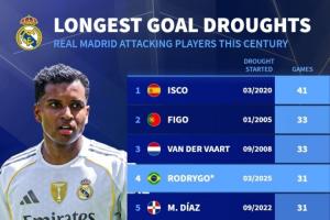 據(jù)德轉(zhuǎn)統(tǒng)計,羅德里戈31場球荒場數(shù)在本世紀皇馬進攻球員上可以排到第4位,僅次于伊斯科、菲戈和范德法特的球荒場數(shù)。