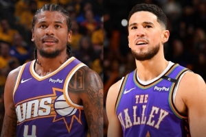 2024-25賽季,杰倫-格林場(chǎng)均21分4.6籃板3.4助攻;布克場(chǎng)均25.6分4.1籃板7.1助攻。